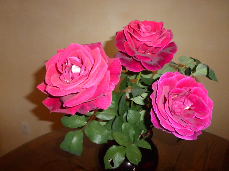 Every day I visit my hibiscus bushes. When it's dry, I carry water to them. Most days (if the sun has been shining) they give me lovely pink, red, and golden flowers. These I carry inside...